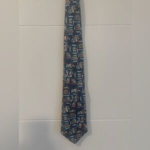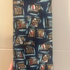 Stylish tie with an abstract pattern. Features shades of blue, red, and brown.