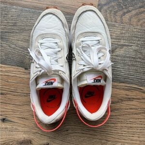 Stylish Nike sneakers with cheetah and orange accents. Features a unique pattern for added flair. Ideal for casual outings. Size 8.5
