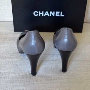 CHANEL Grey Black Leather Cap Toe Pumps Size 6 1/2