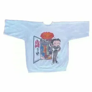 This vintage white crewneck sweatshirt from FREEZE features a colorful all-over print of the beloved cartoon character Betty Boop. The pullover style has cut off half sleeves, a crew neck, and is made of a blend of polyester and cotton materials. This item is considered pre-owned and has a 90s retro theme.