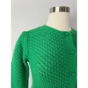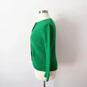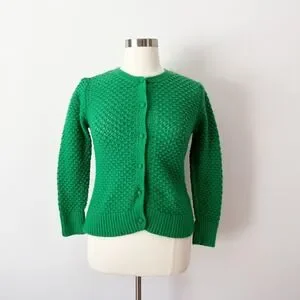 This cardigan has a vintage 40s aesthetic that I love. Classic crew neck crafted from a soft wool and angora rabbit hair blend. This vibrant green sweater features a tactile popcorn or honeycomb knit texture throughout, providing both warmth and visual interest. The front is finished with matching fabric-covered buttons and a ribbed hem and cuffs. Excellent preowned condition, no flaws to note.