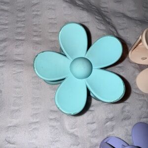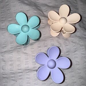 Charming set of three flower-shaped hair clips. Includes pastel blue, cream, and lavender colors. Perfect for adding a playful touch to any hairstyle.