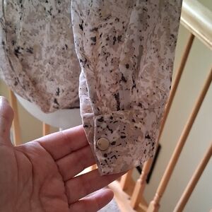 Chic blouse with a unique pattern. Lightweight and stylish. Ideal for versatile wear. Front metal buttons have slight color loss. See last pic. Snap closure. Not noticeable unless you're super up close.