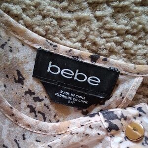 Bebe Blush Pink And Black Abstract Patterned Blouse With Keyhole Back Panel