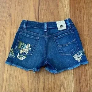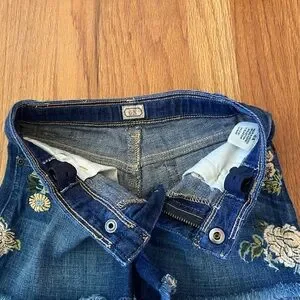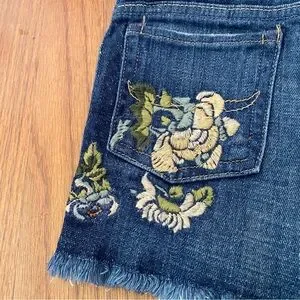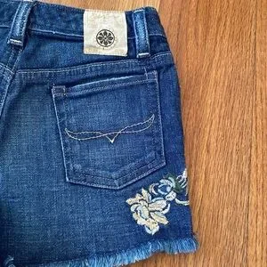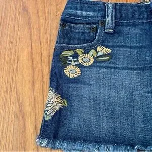 Charming blue denim shorts with floral embroidery with adjustable elastic bands inside.Frayed hem adds a playful touch. Ideal for casual wear.Preowned but in excellent condition. Size 6x