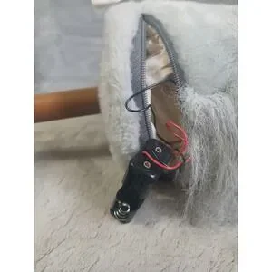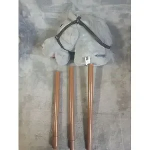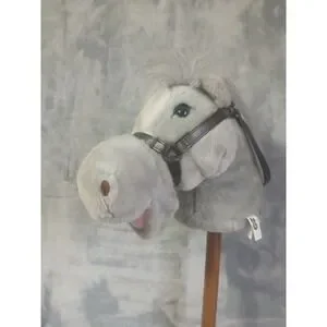 Vintage hobby horse features a soft plush grey head with a white blaze and a fuzzy mane. It comes equipped with a brown faux-leather bridle and reins for imaginative play. The sturdy plastic stick is designed in three push-together sections, making it easy to disassemble for storage or travel. This classic toy provides a nostalgic feel and is perfect for active indoor or outdoor fun. The horse makes clip-clop and whinnying sounds. It is tested and working and uses 2 "AA" batteries (NOT INCLUDED).