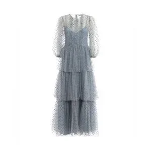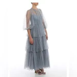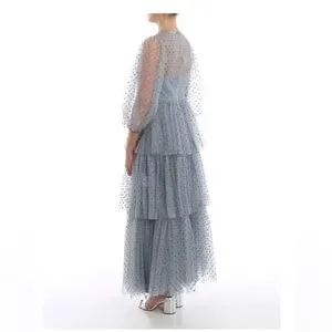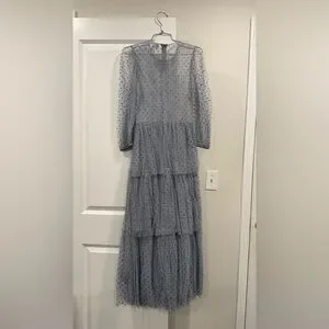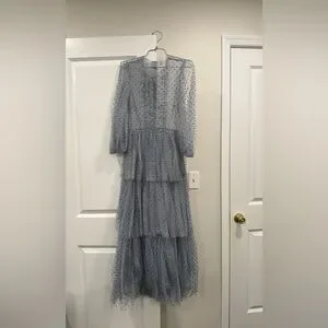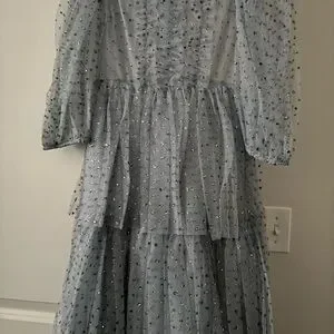 Chic long sleeve dress with sheer overlay. Features polka dot pattern and tiered design. Perfect for elegant occasions. Comes with a light blue shell lining for the top if you’d like more coverage