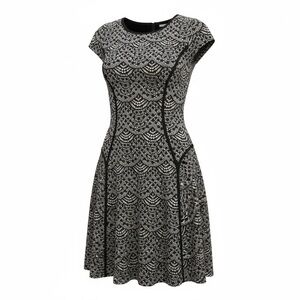 Chic black and cream dress lace with delicate patterns. Perfect for festive occasions. Flattering midi length with flared skirt. Stretchy fabric.