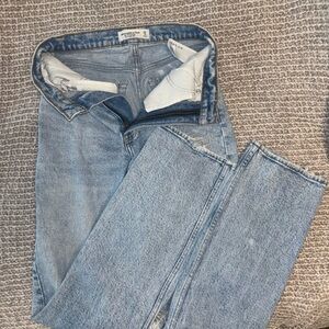 Light wash ‘90s straight ultra high rise denim. Distressed style. One of my favorite pair from A&F, I’ve just gained some mom weight and need a new size🤧