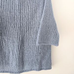 Soft and airy mohair-blend sweater in a loose open knit with an effortlessly slouchy drape. Features elbow-length / short dolman sleeves that add to the relaxed, modern silhouette. Cloud-blue tone, cozy texture, and easy fit give it a Scandi minimal, soft girl, cozy chic vibe—perfect layered over a camisole or bralette for that effortless, lived-in aesthetic. Ideal for transitional seasons and elevated casual looks.