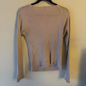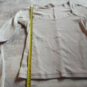 Soft cream ribbed fitted long sleeve top with square neckline and flattering seam detail. Comfortable stretch fabric with clean minimalist loungewear silhouette.