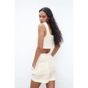 High-waisted shorts with elastic waistband at back and ruching. Front darts. Front pockets and back patch pockets. Turned up cuffs. Front button closure.