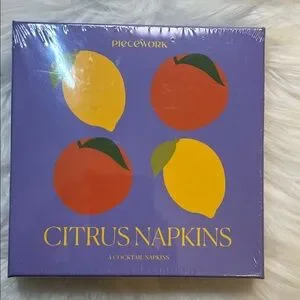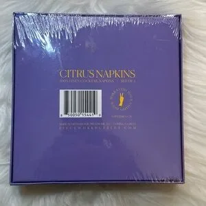 A zesty set of four citrus-themed, 100% linen cocktail napkins—two orange, two lemon—for cocktails with a twist.