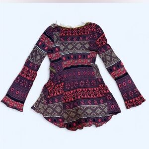 Vibrant long sleeve dress with intricate patterns. Features a mix of colors and a flattering fit. Perfect for any occasion.