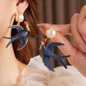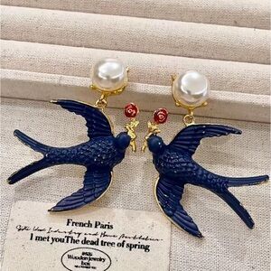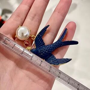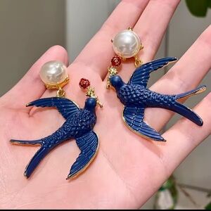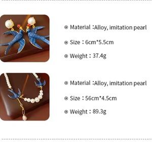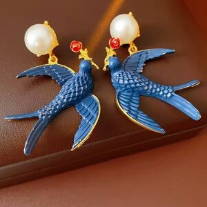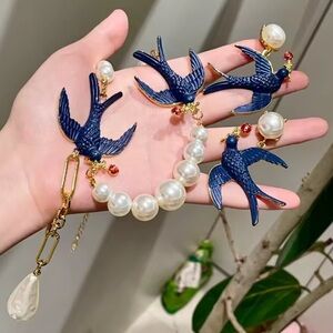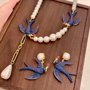 Charming blue bird accents with lustrous pearls. Adds elegance to any look.