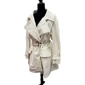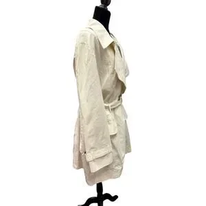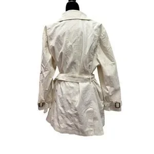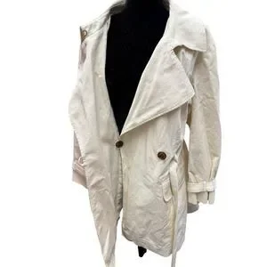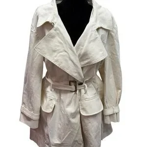 Timeless and ultra-flattering, this Talbots 20W trench coat comes in a gorgeous cream/ivory shade and is crafted from a sturdy 100% cotton fabric. It features a statement wide lapel, adjustable belt, double-breasted front, and classic trench details.