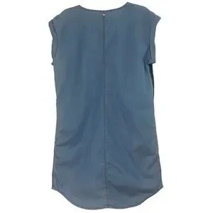 This dress is in great condition! Chambray shift dress with v-neck, roll-cuff sleeves, pockets at hips. Dark wash front, medium wash back. Pair with high boots for a great fall outfit!