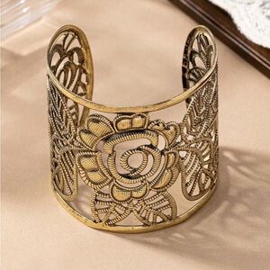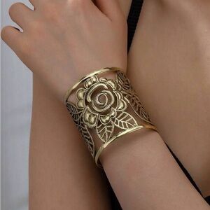 This stunning gold floral cuff bracelet adds a touch of elegance to any outfit. Perfect for any occasion.