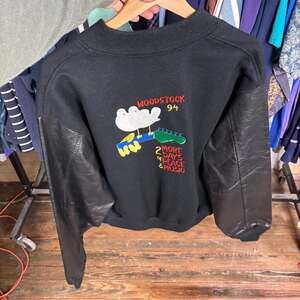 Vintage 1994 Woodstock Music Festival Varsity Jacket. This rare collectible commemorates the '2 Days of Peace & Music' with premium construction, featuring a 100% wool shell in black and genuine naked leather sleeves. The front chest and back both feature high-quality embroidery of the iconic Woodstock dove and guitar neck logo.
