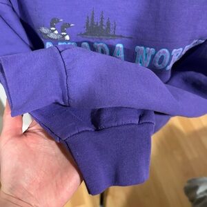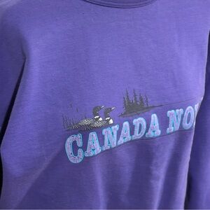 Comfy and cozy vintage cotton and polyester blend (50/50) crewneck pullover sweatshirt! Says Canada North across is with a duck on the lake graphic. Made in Canada by Première Fleecewear. Great vintage condition, some cracking in the wording of the graphic, which, in my opinion, actually sort of adds to its charm ✨ Pit to pit - 26”