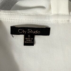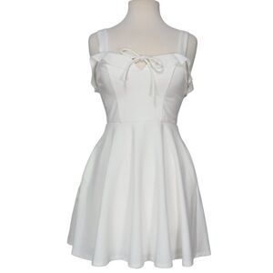 This elegant white mini dress by City Studio features a pleated skirt and a charming tie front detail, ideal for bridal or cocktail occasions. The sleeveless design boasts a sweetheart neckline with spaghetti straps, creating a flattering fit-and-flare silhouette. Its light and airy fabric ensures both comfort and style.