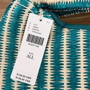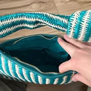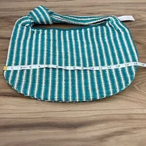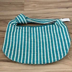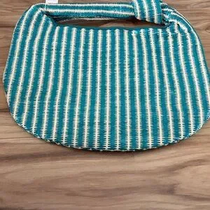 Stylish handbag with teal and white stripes. Perfect for casual outings.