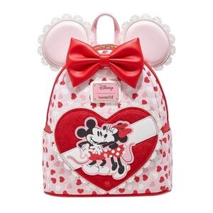 Adorable Loungefly backpack with Minnie Mouse and heart design. Features a large red bow and playful patterns. Perfect for Disney lovers.