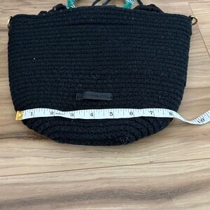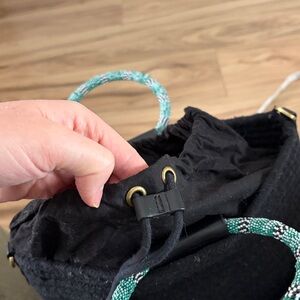 Stylish black woven bucket bag featuring a textured exterior and unique rope handles. Designed with a drawstring closure to keep your belongings secure.
