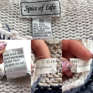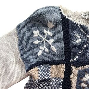 Keywords: Spice of Life sweater, vintage patchwork sweater, granny square sweater, ramie acrylic sweater, knitwear, blue beige sweater, artisan sweater, unique, cozy, fall winter fashion, retro sweater, embroidered sweater, cottagecore, crochet