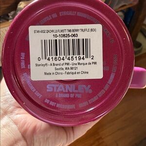 Stanley tumbler with vibrant pink and purple design. 40 oz capacity.