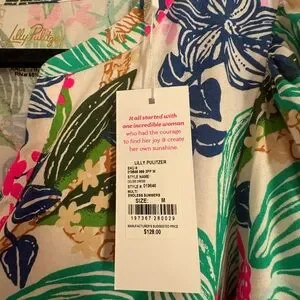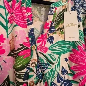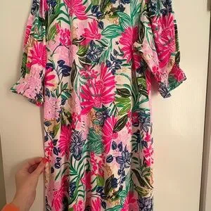 Spring is finally right around the corner! You can’t go wrong with this bright, new with tags, Lilly Pulitzer spring/summer dress. This is a beautiful vibrant dress with a tropical print. Features pink, green, and blue hues. Ideal for sunny days!