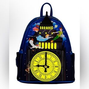Charming backpack with Peter Pan and friends flying over a glowing clock. Ideal for adventure lovers.