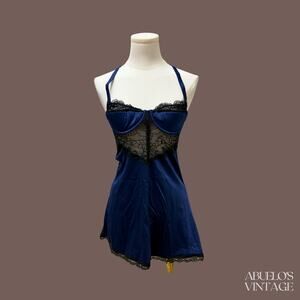 Sultry vintage Fredericks of Hollywood slip dress in deep sapphire blue with black lace paneling. Features underwire cups, a sheer lace midsection, scalloped trim, and an open back with adjustable strap detail. Soft stretch nylon blend in a flirty mini silhouette with a subtle flared hem. Classic Y2K lingerie energy, equal parts coquette and 2000s party girl coded.