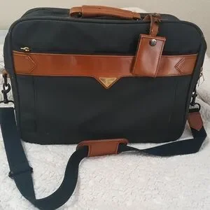 Elegant briefcase with black body and brown accents. Ideal for business use. Features a comfortable strap and secure closure.