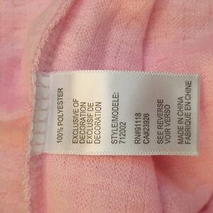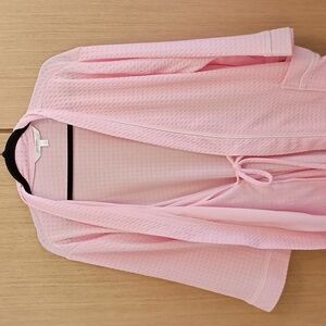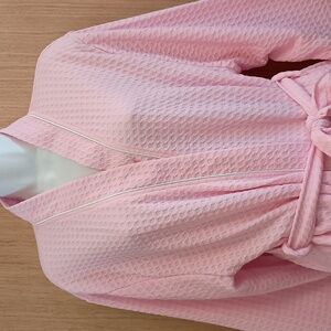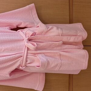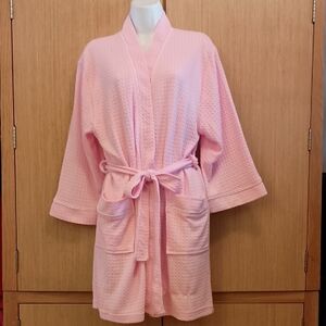 New without tags, no flaws, smoke and pet free. A pink waffle weave knee length bath robe. The robe has an inside tie and outside ties to adjust for your comfort. Two (2) nice size pockets on the front. Lightweight and pretty...