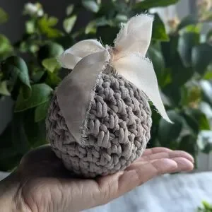 Elevate your home decor with this handcrafted hand crocheted cream ornament, featuring a cream ribbon and silver ornament topper. Perfect for adding a touch of sophistication to your holiday decor and Christmas tree.