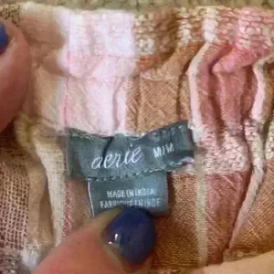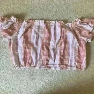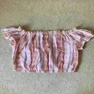 Super cute pink, coral, purple and white plaid crop top from aerie. The blouse is off the shoulder. Very unique and adorable!