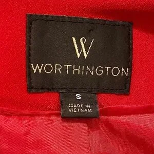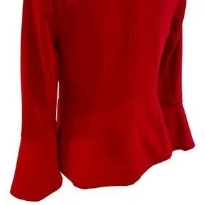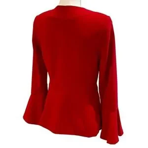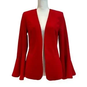 Elegant red blazer with flared sleeves. Open front design. Perfect for formal occasions.