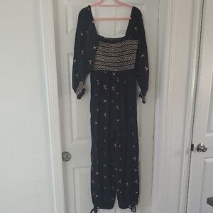 Elegant black jumpsuit with intricate embroidery. Features puff sleeves and smocked bodice. Perfect for stylish occasions. Gently used condition.