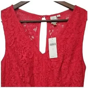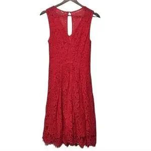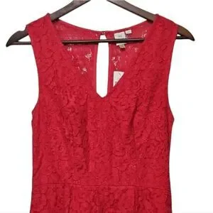 This stunning red lace v-neck dress is perfect for any occasion. Its elegant design and vibrant red color make it a standout piece in any wardrobe. The pit-to-pit measurement is 17 inches. The shoulder to the bottom hem length is 40 inches. Material: Cotton, nylon, Viscose, and Lyocell blend. Linning: 100% Viscose. New with tag.