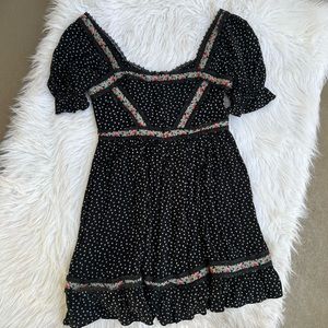 Anthropologie | Love Sam Cassandra Dress. Black embroidered sweetheart neckline puff sleeve. Cute and flirty. Festival Cottagecore prairie