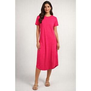 This casual and comfortable dress features a vibrant pink color, short sleeves, and a relaxed midi length perfect for everyday wear or casual outings.
