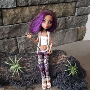 This is a 2008 Monster High Clawdeen Wolf doll. Clothes are not original and no accessories are included. Light glue seepage in hair, as is typical for these dolls and loose limbs so requires a stand (not included). Great for parts or play.