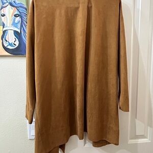 Chic tan trench coat with a draped open front and convenient side pockets. Perfect for any occasion.