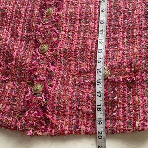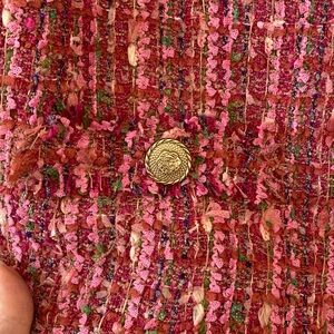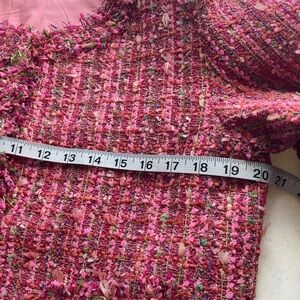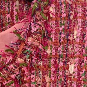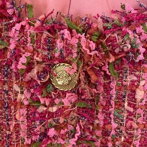 Add a touch of sophistication to your wardrobe with this elegant pink & green Boucle style blazer. Its vibrant color and intricate design make it perfect for both casual and formal occasions.