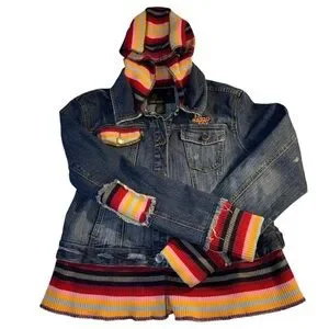 Vintage Jr Girls XXL Jean jacket hoodie with multi-colored, knitted accents and hood.