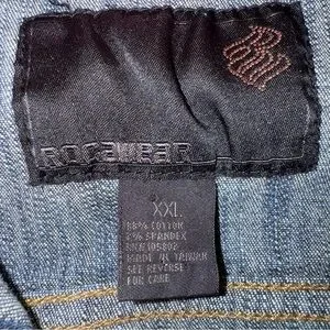 The image shows a Rocawear Jr Girls XXL blue denim jean jacket with a hood and multi-colored knit accents. The jacket features a standard denim construction with button-down closure, chest pockets, and a classic collar. However, it incorporates unique design elements such as a striped knit hood, cuffs, and hem, adding a playful and colorful touch. The size XXL suggests it is designed for older girls or teens.