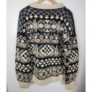 Shangrila Craft Men's Sz. XL Hand Knit Cream/Grey/Black Wool Heavy Sweater