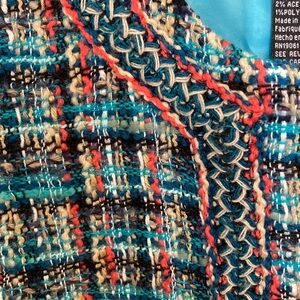 Chic tweed blazer with a turquoise & orange pattern. Features a tailored fit and stylish design. Perfect for versatile wear.