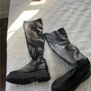 Step out in style with these sleek black thigh-high boots. Perfect for any occasion, these boots offer both comfort and elegance.